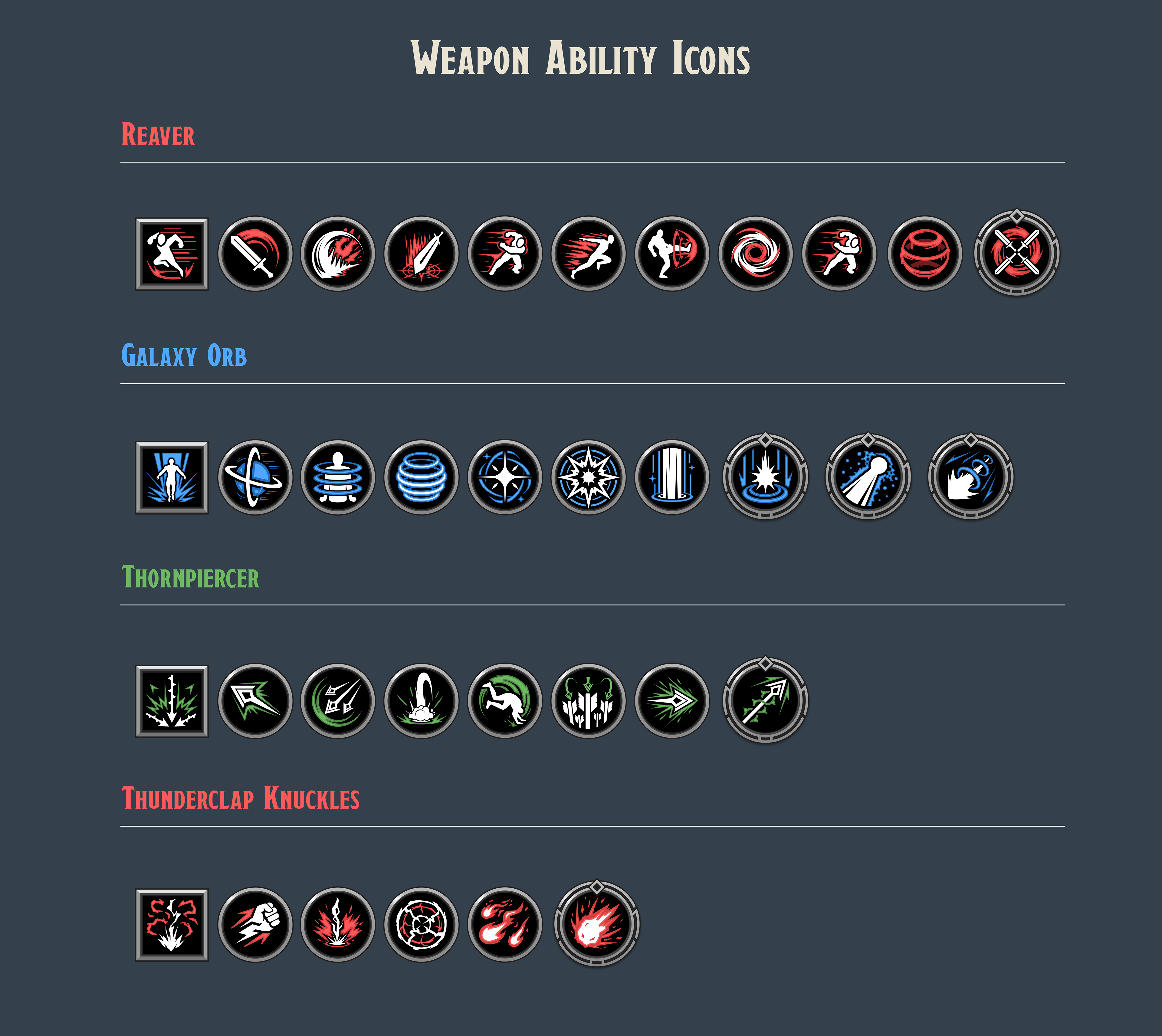 In addition to developing various features, I was responsible for the conception and implementation of the majority of in-game iconography. Below are some examples of the ability and loot icons I designed.