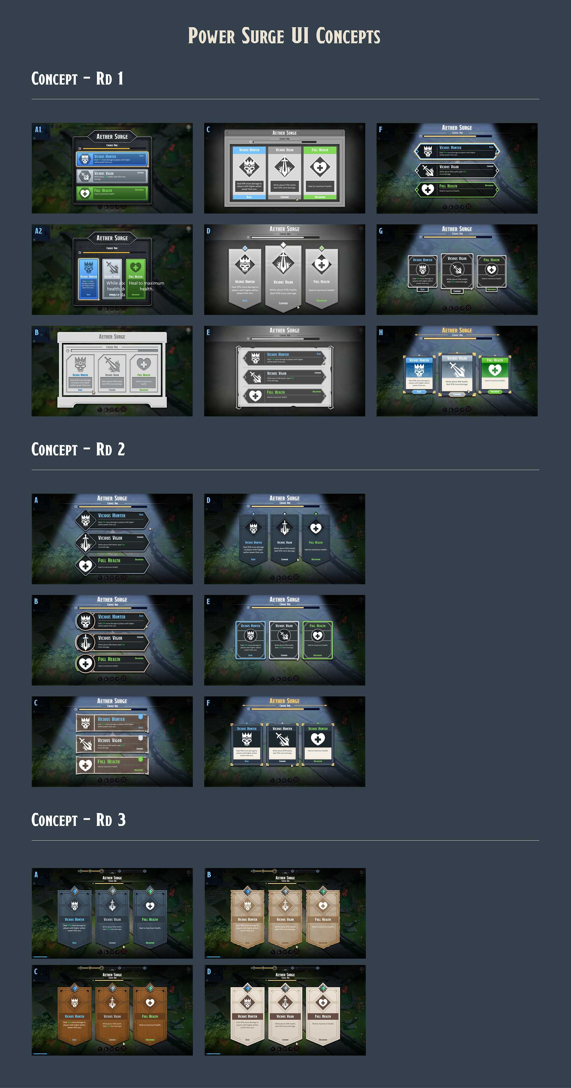 I began by conceptualizing layouts that would avoid obscuring gameplay while retaining all necessary content. After iterating through various button and card configurations, I decided on a free-floating three-card layout, as it provided a more intuitive selection process for players. Subsequently, I rendered several stylistic variations to identify the best fit for the game's overall schema. I opted for a shale slab-like texture with a rune stone aesthetic to capture the dungeon's dark and mysterious undertones.